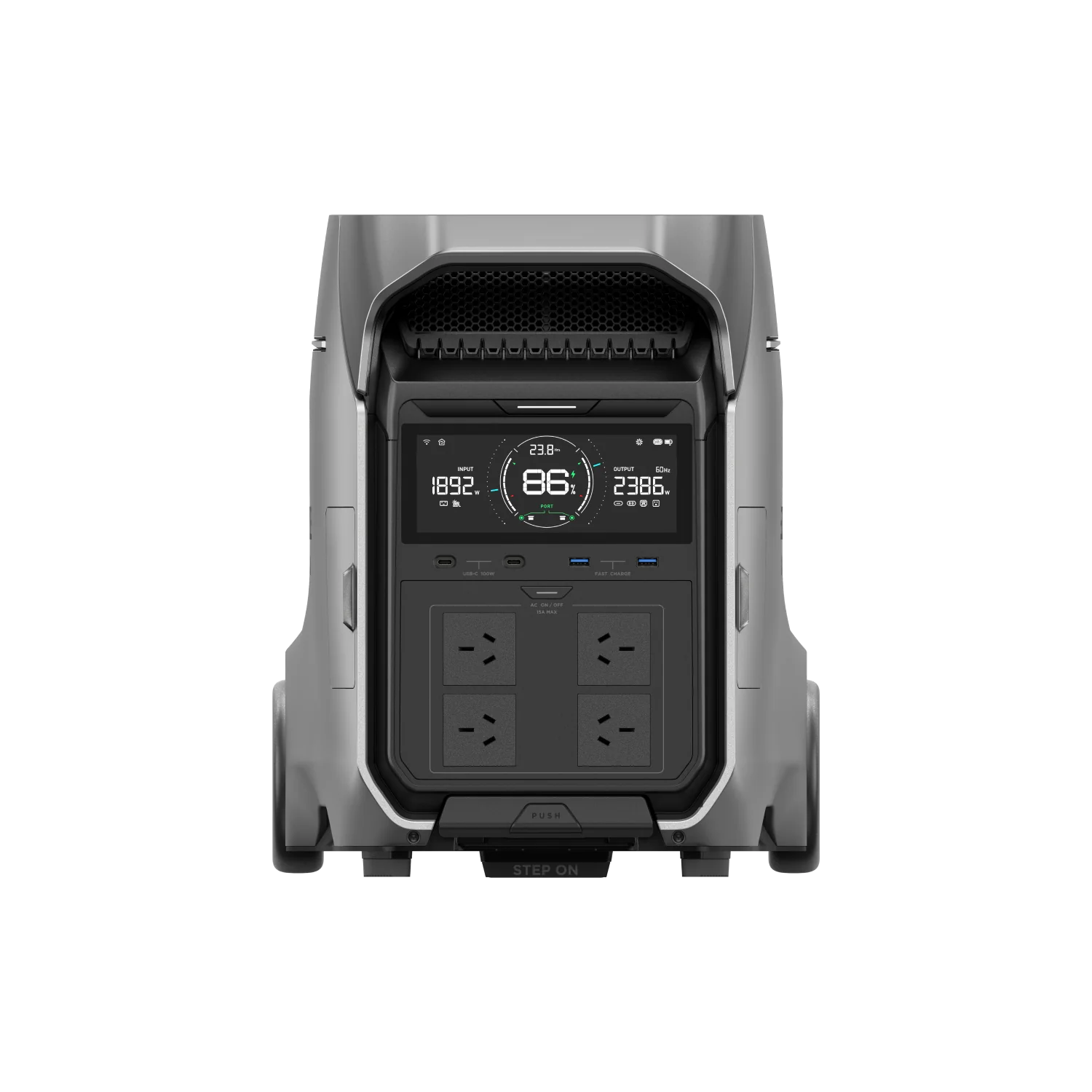 | AC Output | 4 outlets, 230V/10A, 3600W total (Surge 7200W) |